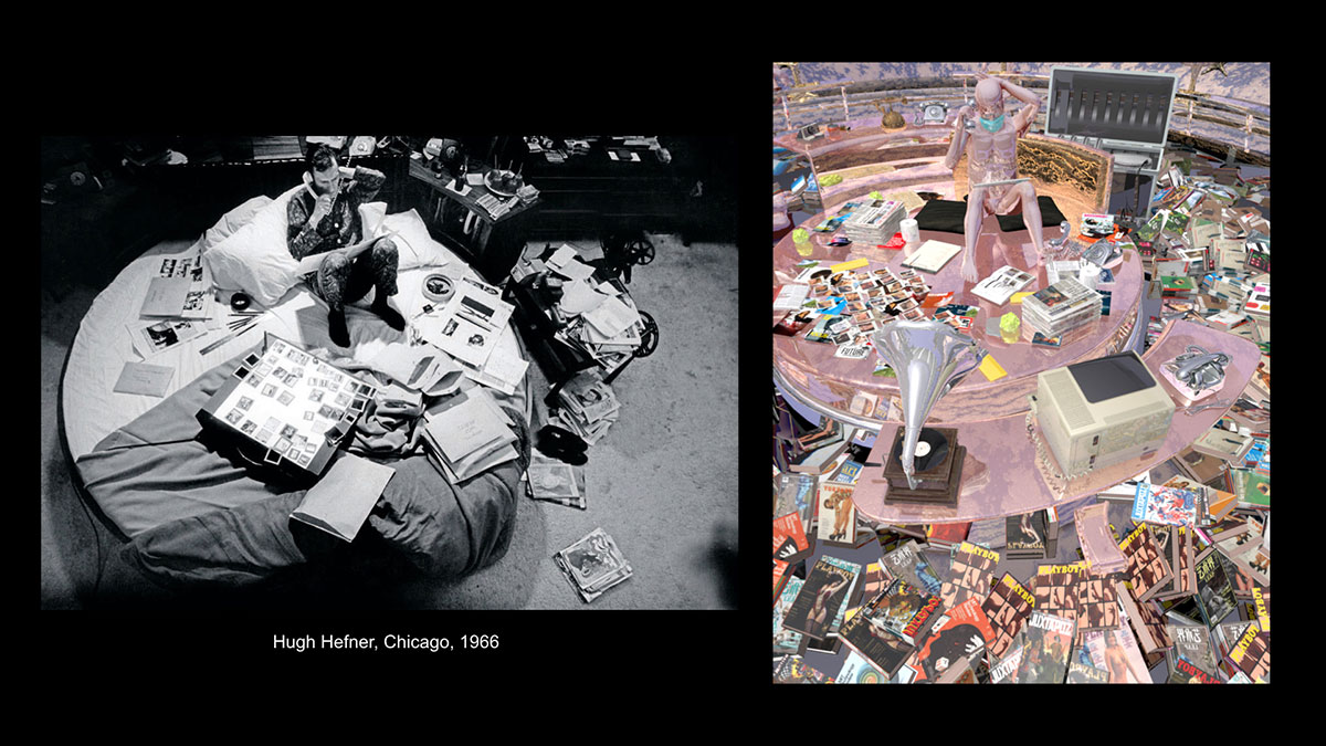 The third reference: Hugh Hefner. In episode 6, the video restores his famous rounded bed in Chicago, which was seen as one of the oldest and most known Work From Home example, where he made more than 20 video recordings a day, with thousands of cables and most advanced telecommunication technologies during his era. Given the fact that many major companies have already announced that their employees could work from home forever, there will be no more distance between work, pleasure, production and sex.