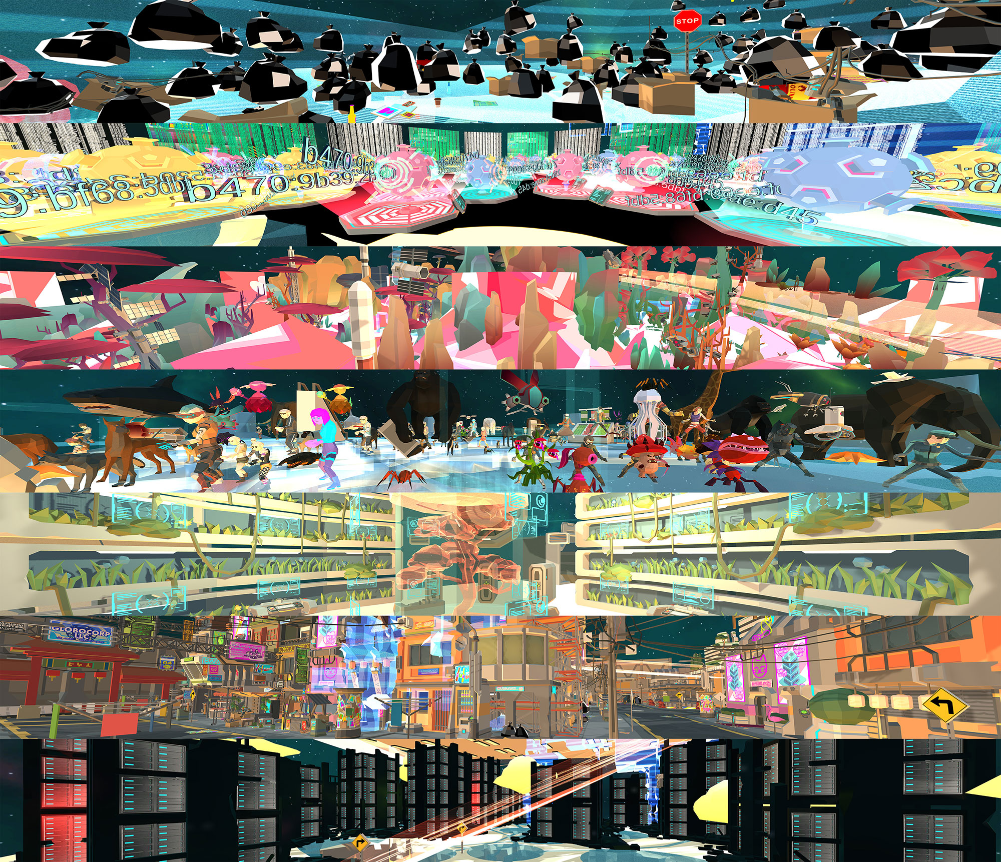 Based on Benjamin Bratton’s Stack theory, the project builds a 6-layer structure (earth, cloud, city, address, interface, user) as an interactive platformer on the Metaverse, and presents it in the form of real-time data simulation + collective world building.